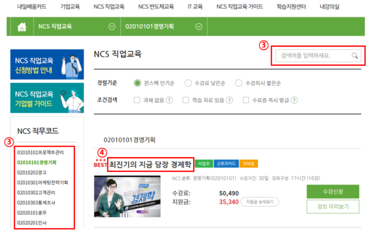 좌측의 [NCS 직무코드 선택]을 통해서 수강과정을 검색해줍니다:)