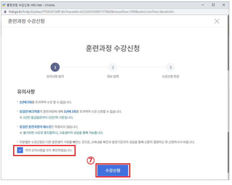 7. 유의사항을 확인한 후, [수강신청]을 다시 한번 클릭합니다.