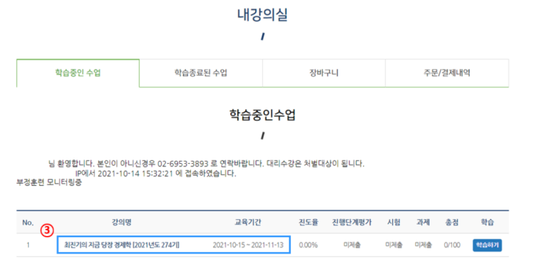 [학습하기]를 눌러서 수강 진행하면 됩니다.