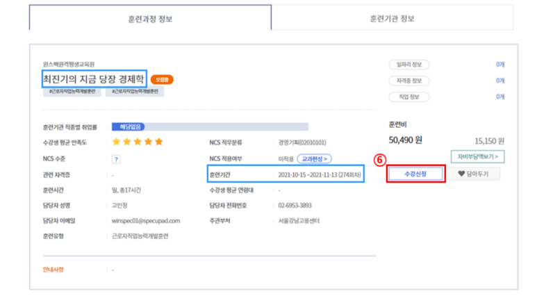 6. HRD-Net 과정정보, 과정명 , 훈련기관을 확인 한 후 , [수강신청]을 눌러줍니다.
