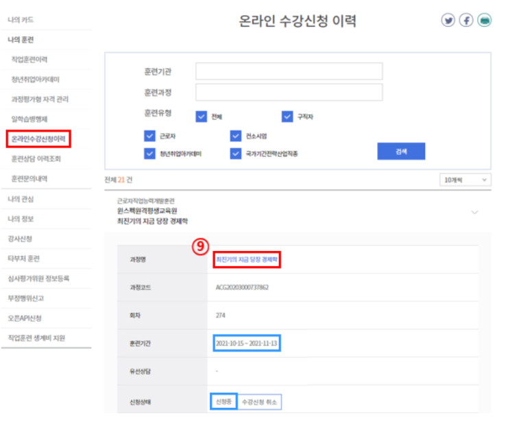 9. [나의정보]-[나의 훈련]-[온라인수강신청이력] 에서