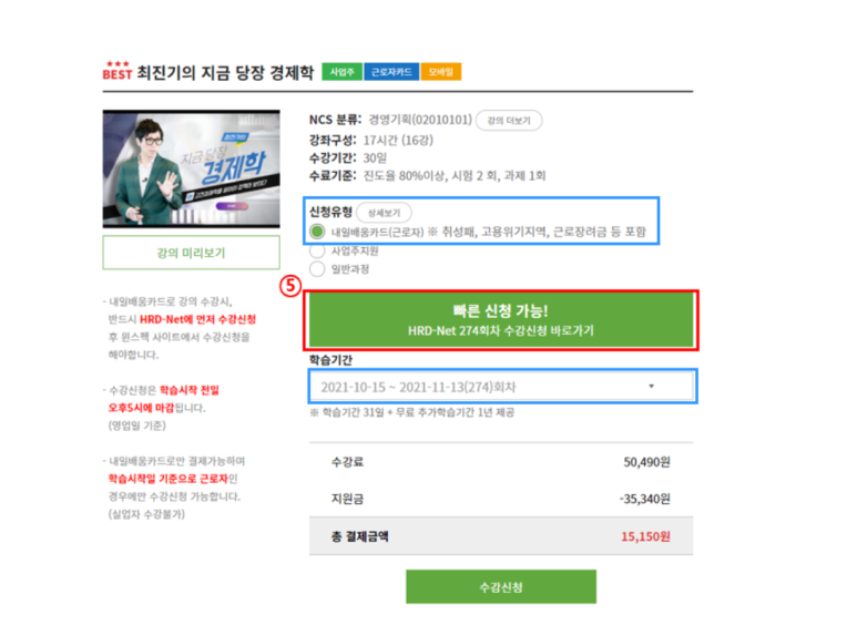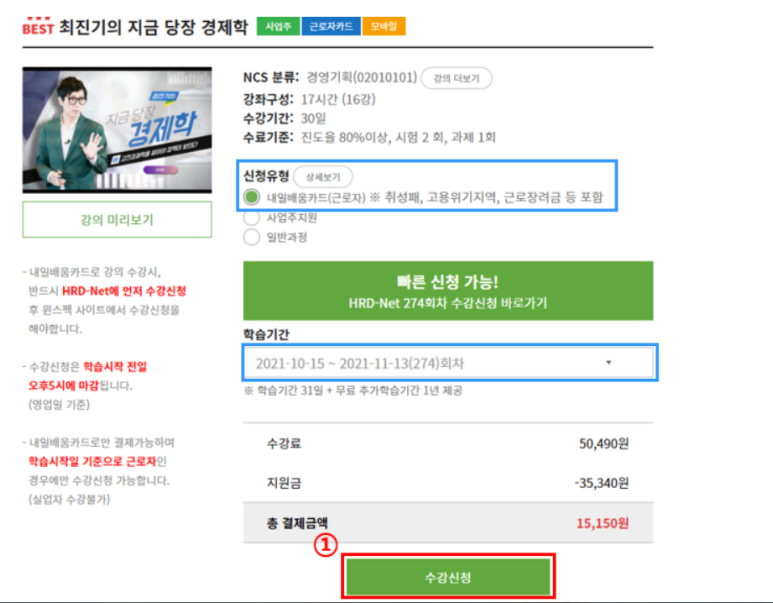 끝으로 국민 내일 배움카드로 수강신청 하는 방법을 설명하고
