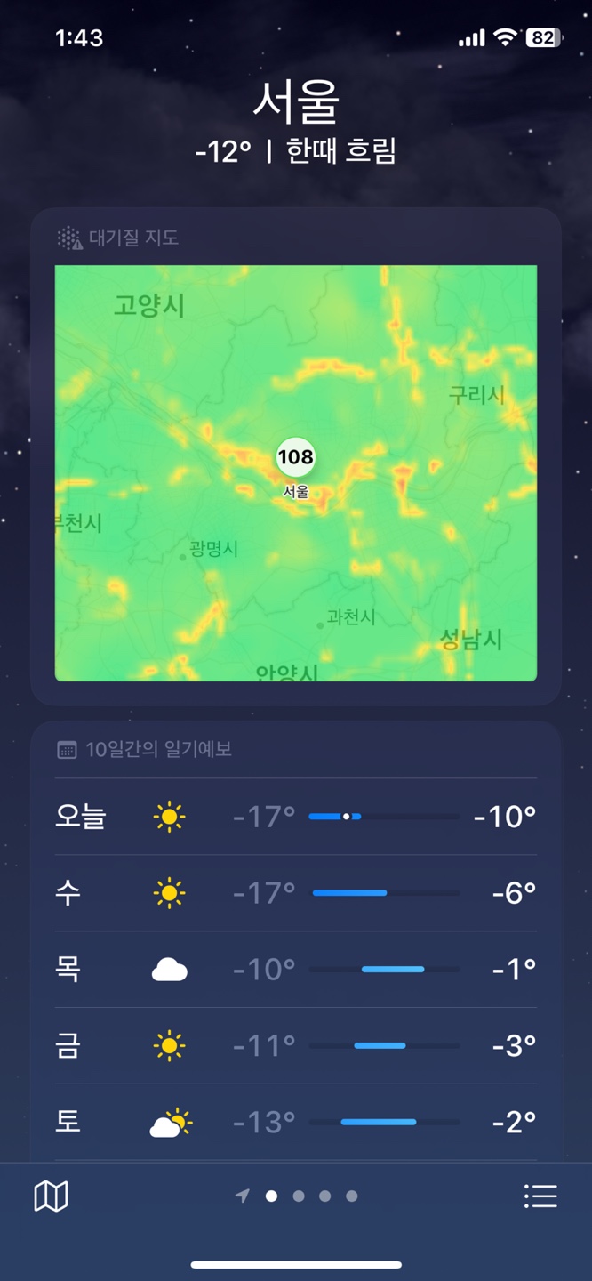 아니 저번에 밖에 나가기 전에 뉴스로 얼핏 엄청 춥다는 얘기를 들어서 원래 날씨 앱 전혀 안키고 사는데 오랜만에