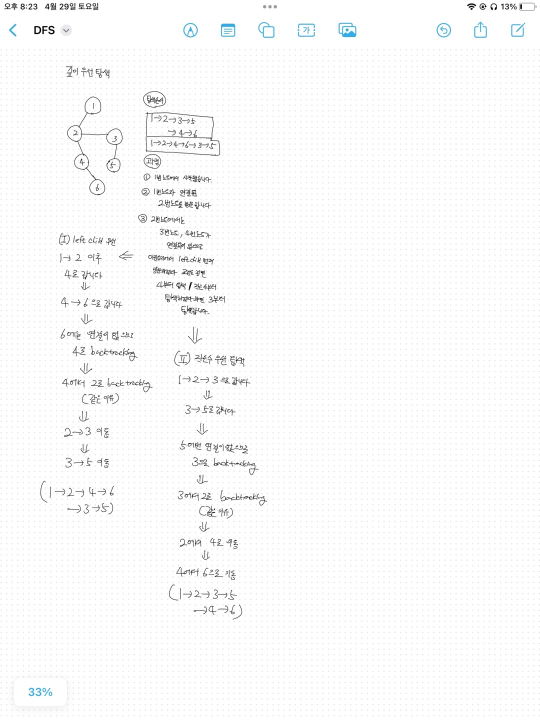 - 재귀(Recursion)방식으로 순환호출 / 스택을 사용하는 방법으로 이루어지며, 어떤 노드를 방문하였는지 여부를 꼭 확인해주어야 한다 (안그러면 무한루프)